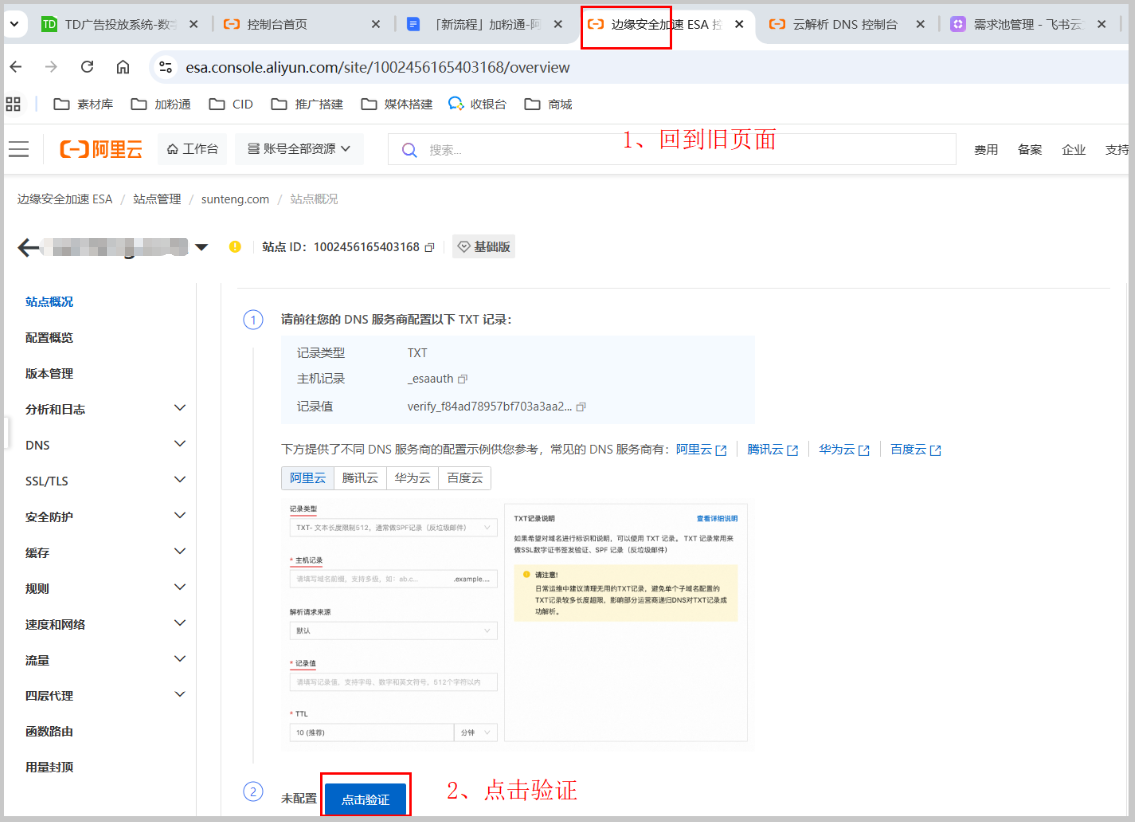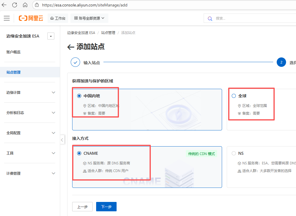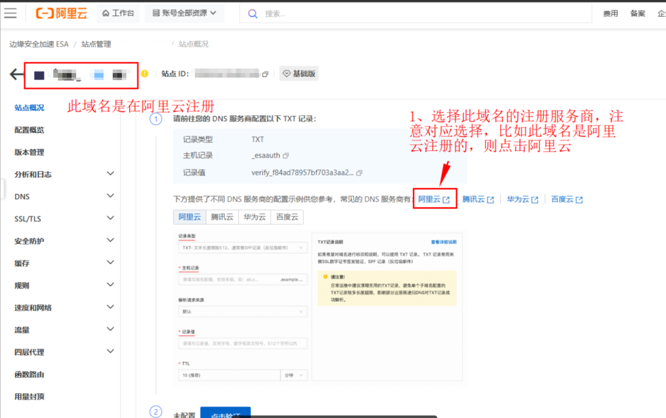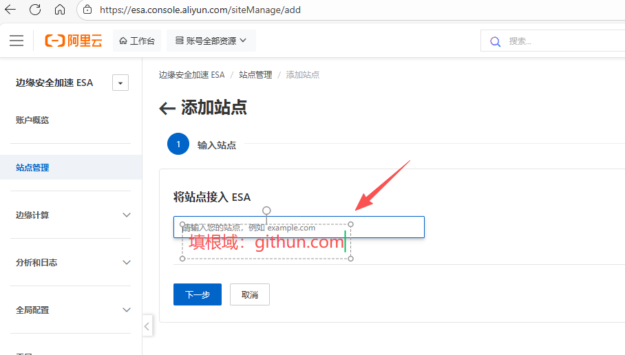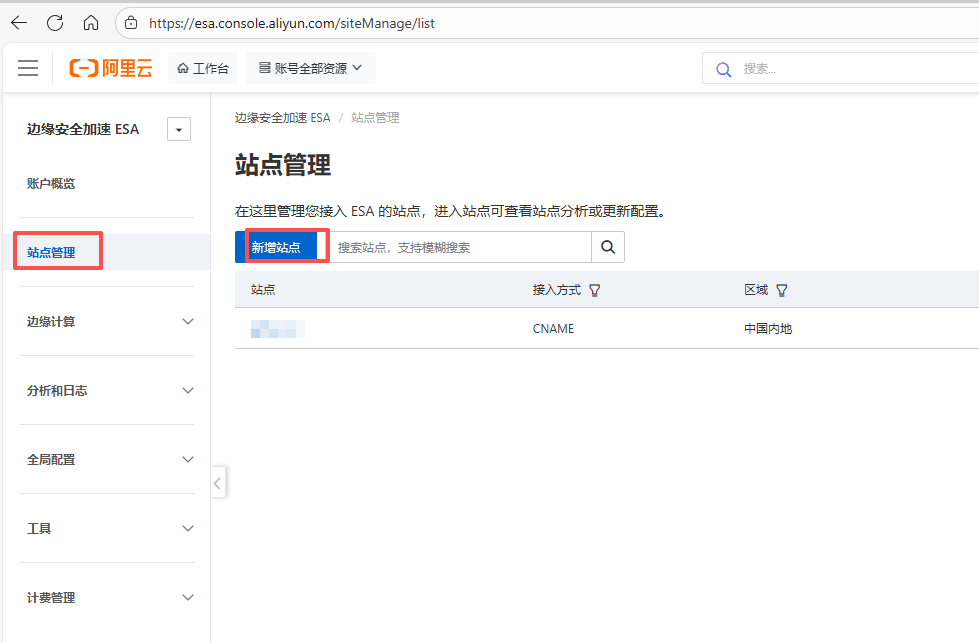 1. 进入"站点管理", https://esa.console.aliyun.com/siteManage/list