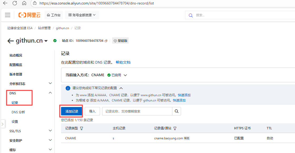 1. 在 DNS - 记录 页面,点击 添加记录 进行DNS记录添加:
