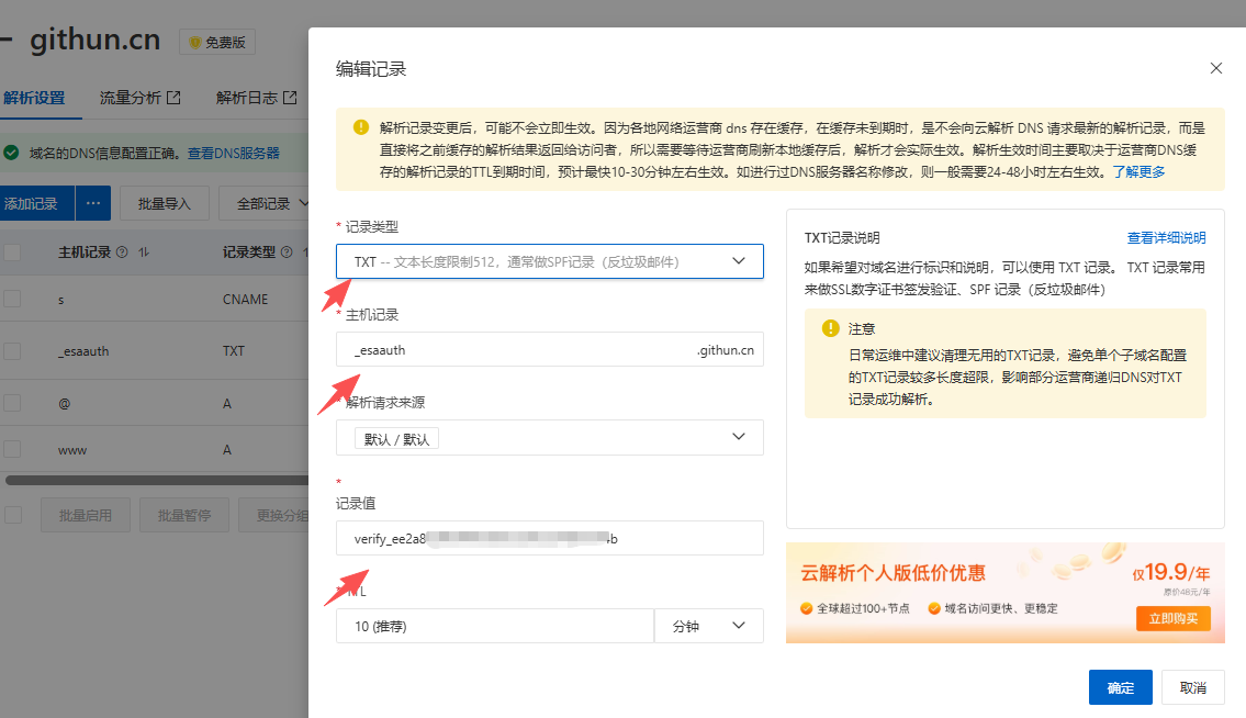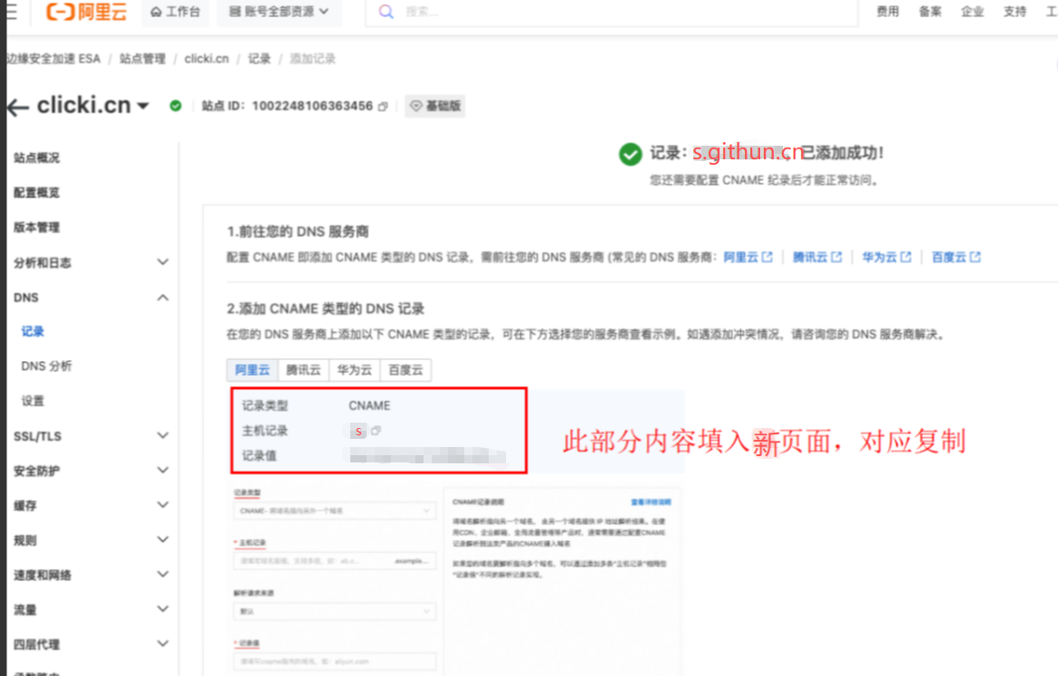 4. 设置s.githun.cn的域名解析,复制下图的值,到域名解析去设置