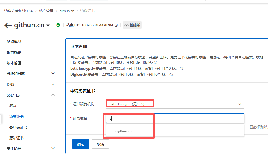 B. 证书域名 根据你的子域名进行搜索,比如你的完整域名是 s.githun.cn,子域名是s。此处输入 s 搜索,然后选中下拉域名。 注意:不支持完整域名搜索