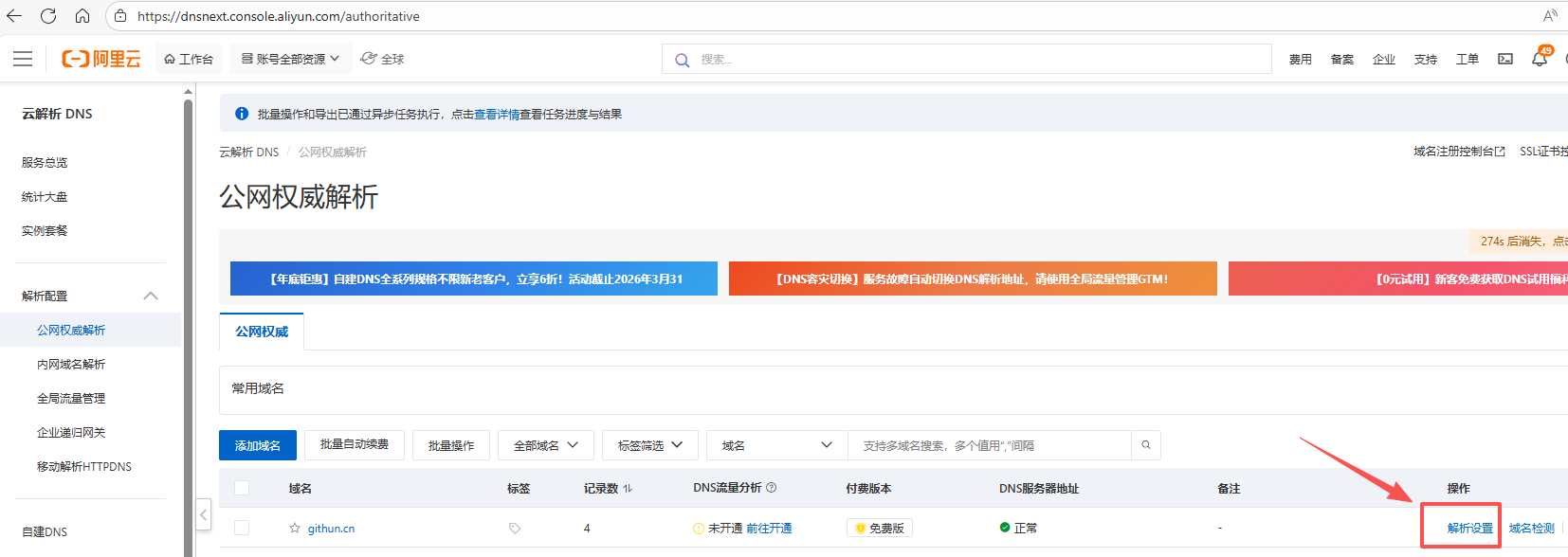 3. 点击对应域名githun.cn的“解析设置”,注意:若域名不在你登录的阿里云账号,此步骤无法自行添加,需域名所属账号添加。请联系对应人添加! 若域名是租赁的,请联系域名售卖商操作!